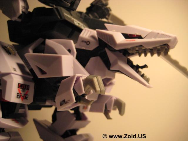 Berserk Fury also sports a pair of "Strike Claws" which can be used similar to those of Liger Zero. Additional weaponry includes: Electron Fangs and it's Strike Smash Tail. Equipment wise Berserk Fury has a Charged Particle Generator, ten vernier thrusters, two high maneuver thrusters, and ion booster pack, and four anchors. The anchors are located on the back of the Zoids feet and are used to stabilize the unit as it prepares to fire the massive charged particle cannon. The downfall of the Berserk Fury possessing the Charged Particle Cannon is that it must remain anchored in the same place to properly fire the cannon due to the high recoil of the blast. Berserk Fury is also capable of using a changing armor system or "CAS". Known as the CP-27 or "Sturm Unit" it removes the Buster Claws while increasing the speed from a 211 miles per hour to an incredible 280 miles per hour maximum. In lieu of the Buster Claws the CP-27 lends the Berserk Fury a pair of claws similar to the Geno Breakers X - Breakers.