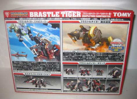 Taking a look at the additional equipment on Brastle Tiger, one will notice the "heat sinks" located in the cuffs and on the tail. These sinks are used to disperse the heat gathered, as it would be nearly impossible and impractical to discharge all of the heat converted energy in one shot. Brastle is an average armored Zoid, with an immunity to heat based attacks. Released as the last model of the NJR line in 2004, it comes with a short DVD.