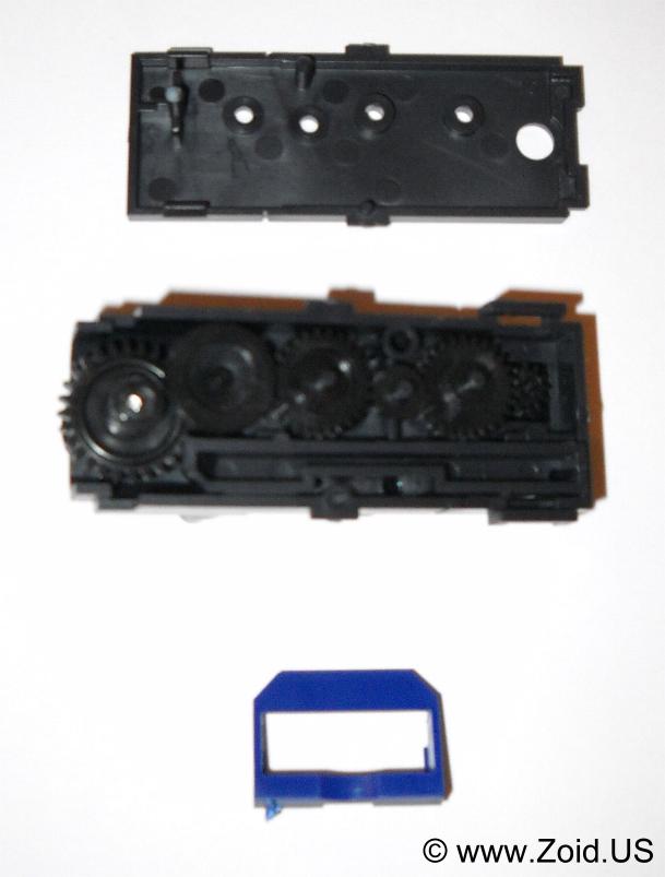 Next, a variety of gears are aligned in the gear box and the box is held together with a rectangular retainer