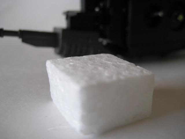 The styrofoam brick is then placed in the body cavity after both face guards. Each face guard houses a set of upper teeth and the bottom jaw plate fits between these two pieces. The eye piece is placed inside the canopy , and the unit begins to take shape.