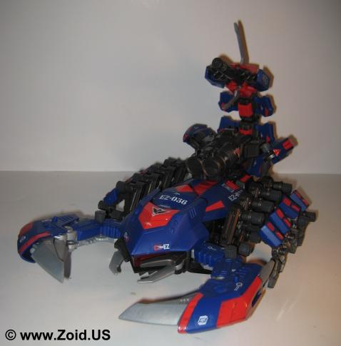 Yet another creation by the infamous Gunter Prozen of the Guylos Empire, and considered to be one of the most powerful Zoids ever created, Death Stinger is a Sea Scorpion type Zoid. Death Stinger is consider a hybrid technology Zoid as it uses both an ancient Zoids core and a reproduction Organoid System. Death Stinger is an amphibious  Zoid and is equally as powerful as it is on land as it is in the water. Death Stinger also has the ability to crush massive amounts of rock, including but not limited to large reef's when it's underwater. Death Stinger posses massive weapons and also makes use of an omni directional "ES" (Electronic Shield). Just like the Death Saurer, Death Stinger carries a Charged Particle Cannon as it's main weapon of mass destruction. Due to the way the Charged Particle Cannon  is mounted, and the numerous legs that provide counter balance and act as individual stabilizers, Death Stinger does not have to remain stationary to fire the unit, and can fire the CPC while in the midst of almost any movement. Among it's other weapons are a large 930 mm Shock Cannon and it's powerful claws. Death Stinger can use its claws to shred through almost any medium to large Zoids armor, exposing the inner frame and rendering the Zoid useless.