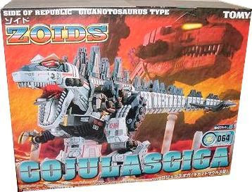 Gojulas Giga does posses mounts to fit a pair of Republic Super Cannons, but they do not come standard. The model is complex for a Zoid, and the build is lengthy.. Just like King Gojulas, the Giga is equipped with a speaker that roars as the Giga walks with it's arms moving and eyes blinking. The model is able to switch modes, true to the back story, and movement changes to match the mode selected. Construction of the unit is easy to foul up, and if one part is not correctly assembled the entire unit is hindered (even more so than normal due to the under-powered motor). Pay close attention when assembling the unit. Gojulas sold poorly in retail stores, making the unit easier to find today. Gojulas Giga has had a total of three official releases; the standard release as seen in both the Hasbro and NJR line, a limited unit dubbed "Prototype Gojulas Giga", and a Fuzors release. Prototype Gojulas Giga was a re-colored version released by Toys Dream Project. True to the first release Proto Giga sold poorly and excess stock quickly dropped in price. Not even TDP could save the Giga. The Fuzors version was re-colored and featured a pair of police sirens that could be installed on the unit. This model is sometimes referred to as "Giggles" in the model building community. Due to it's massive numbers Gojulas Giga can often be picked up for a small sum, allowing many Zoiders the luxury of customizing and cannibalizing the unit. Unfortunately most Gojulas Giga (and variations) suffer from what known as "shedding" and lose arms and armor pieces both frequently and easily.