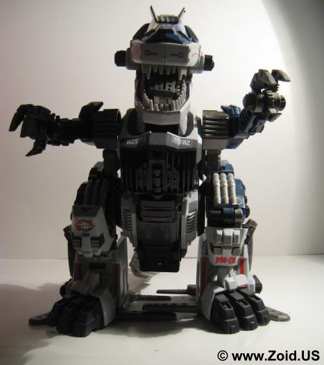 In order to effectively fight in close range situations the Gojulas Giga was built with amazingly powerful jaws, and the "standard Gojulas tail attack" was improved upon by adding a pair of laser razor blades capable of slicing through thick armor. This enabled the unit to quickly swipe with it's tail smashing the opponents armor, and following up with literally tearing the unit apart with it's teeth and claws. Gojulas Giga also makes use of superior defensive technology by employing what has come to be known as an "Electronic Shield" which resembles a force field of energy that surrounds and protects the unit. Further advancing defense systems, Giga is equipped with a high powered anti Electronics Counter-Measure device which protects the unit's transmissions from being jammed by anti-communication Zoids like Dimetrodon