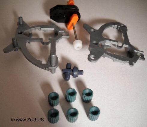 The build begins with sandwiching the motor and neck piece between the right and left main frame pieces, this is secured with a total of 6 caps.