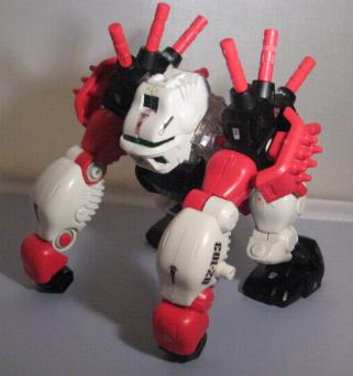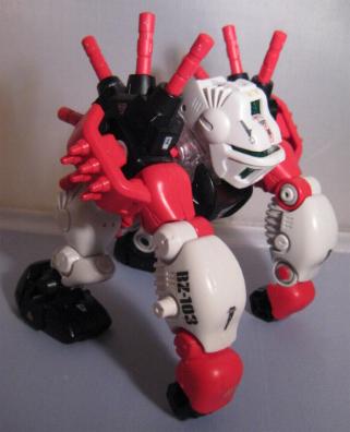 Gorilla Tron is a Hasbro exclusive release. I think it is another example of an "overlooked" Blox Zoid. Gorilla Tron shares the same flashing light center piece pseudo blox unit as Ray Saurer, and that's about the only "gimmick" it has, yet this Gorilla really shines in design and build. If you take a close look at the box you can see a few minor differences mainly on molding of the head unit. The unit pictured on the box has an extra "ridge" that, while not necessary, provides a little bit more depth and detail as well and gives a distinct surface to sticker. The build is simple yet, for some reason, very fulfilling. I truly enjoy the missile ports that adorn each shoulder. On the downside there are VERY few stickers pictured on the box that this unit actually comes with. It makes for a nice night of playing "lets search through the sticker bin, all night", but does get irritating. Let's take a closer look at BZ-103.
