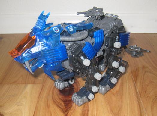 The NJR and Hasbro release of the Shield Liger are the most abundant of all releases. This version saw a deeper blue color as well as an orange canopy. It is with this release that TOMY scaled down the battery compartment to fit only one double A battery instead of the usual two. The battery lid was also changed from a clip closure to a screw down closure. Shortly after this release Hasbro released a Holo Tech version of the Shield Liger. The body was a transparent blue and grey. This unit is seen in Canada, and is harder to locate. About a year ago a case of Holo Tech Shield ligers were discovered in the remnants of an old toy store. The founder has been supplying eBay with a steady stream of them since, and they seem to be getting sparse. Expect $40.00-$80.00 to land one.