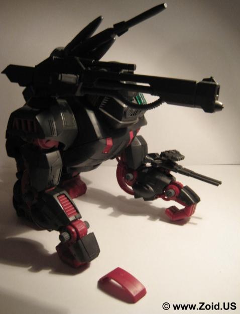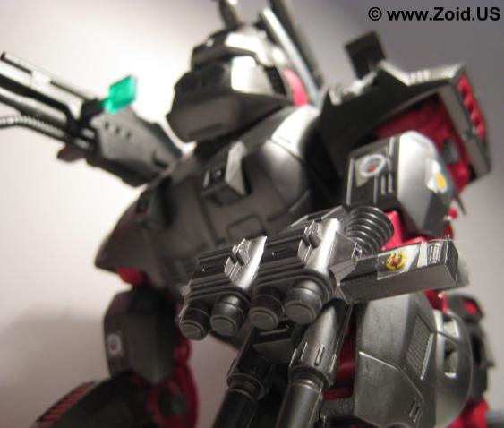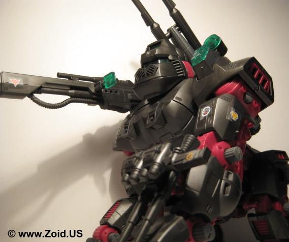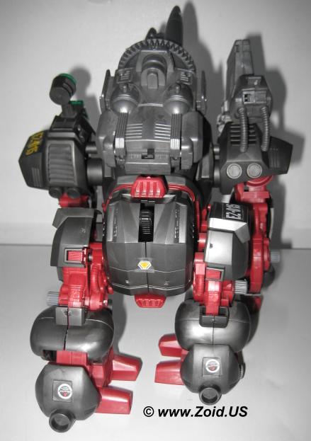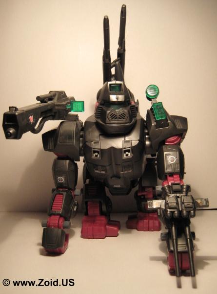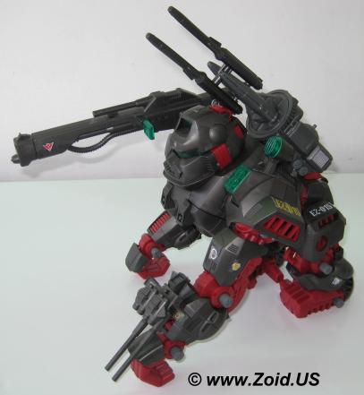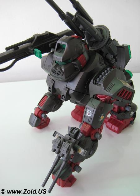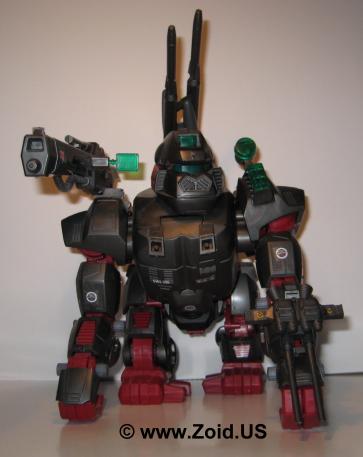 The beast known as "Iron Kong PK" was finished in blood red, and is often referred to as the "Bloody Kong". This Iron Kong featured the same weapons as the MK II Ltd. and was based on the Battle Story in which Gunther Prozen who (at the time) was the Guylos Empires "Minister of War". The "PK" stands for Prozen's Knights. The Prozen Knights were elite body guards that protected Gunther Prozen and used the special blood colored Iron Kong as their standard units. Most of the PK units were destroyed when the Bloody Death Saurer self destructed. This brings us to yet another release of Iron Kong known as the "Shwartz Kong". The Shwartz Iron Kong is labeled as the "Schubaltz Iron Kong" and is basically a black Iron Kong with red armor. The Shwartz Kong features a gatling gun atop it's left shoulder, and was the Iron Kong responsible for bringing down the Bloody Death Saurer.