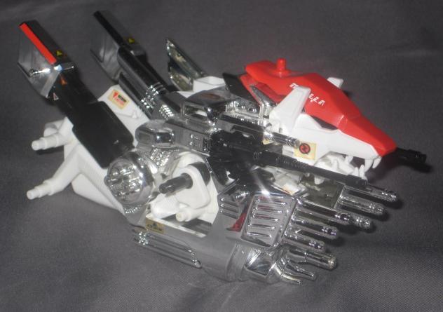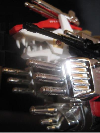 You may have noticed that (this) King Baron sports Silver instead of gold chrome. When I purchased him I was unsure of the Silver chrome's origin, and had thought it to be painted. I can tell you that it came this way from the factory. This finish is not dull and is highly reflective indicating that it was not altered by conventional paint methods. Under the chrome, the sprues are usually either black or a really translucent white (ghost Zoid) material, so it is unlikely that the gold finish "wore off", as the silver finish is evenly distributed and unmarred. My guess is that it accidentally got the wrong vacuum finish in the factory, perhaps God Kaiser?. This makes it one of my more unique, highly treasured, factory flawed pieces.