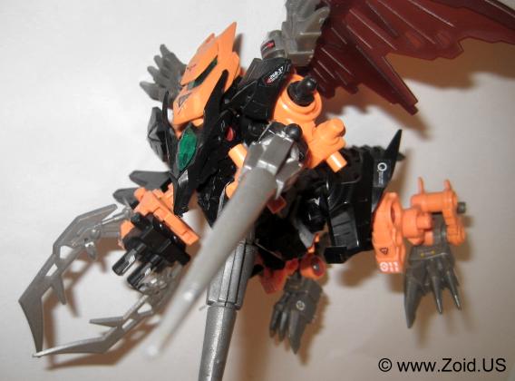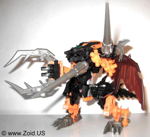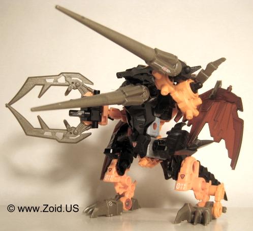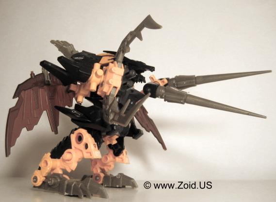 Lord Gale also has a plethora of weapons including "Hell's Fang" which (name wise) strikes a very similar resemblance to Deadly Kong's "Hell's Box". He is also equipped with a set of spears referred to as Magnesser spears on his right "hand", and a very crustacean like Magnesser claw on his left "hand". Strike Claws, X Scissors, a Magnesser tail, and a double barrel cannon make up the rest of Lord Gale's arsenal. The "Magnesser" material is usually found on aerial Zoids and "translates" roughly to a magnetic repulsion system allowing flight. Magnetic repulsion was Zoidian technology that allowed lift and propulsion as well as both vertical take off and landing capabilities. It is also said to have very low maintenance requirements allowing the Zoid in possession of Magnesser armaments an extreme amount of in flight time before having to be serviced. I'm speculating that Lord Gale used it's tail as a rudder, and it needed to be just as capable of performance as did the wings thus it is also listed as being composed of Magnesser.
