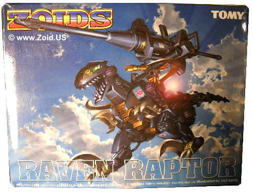 The last release year of the Raptor featured another name and color change. In 2003 the Yuji Kaida series released the "Raven Raptor". Shown on the box front descending from a clear blue sky, it's box art is one of the most memorable of all Zoids boxes. The eighth Zoid in the Yuji Kaida series, Raven Raptor was now presented in black and grey and kept the Pile Bunker from it's former incarnation which was re-colored in gray. This version also included a new sticker sheet. This same year also featured the European or "NER" release of the standard version of Rev Raptor.