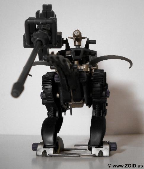 Rev Raptor is a small build, and despite the flaws commonly observed in it's engineering is a nice Zoid to have. The dual scythes and overly large claws lend it a menacing look. Rev Raptor can mount one Custom Part or "CP" unit. The CP-08 or pile bunker is a large back mounted spear / jack hammer that can function as both an offensive penetrating weapon and as a utilitarian jack hammer useful for destroying structural supports. The pile bunker is actually designed to be used in pairs rather than separately, and when mounted on a raptor gives it an even more menacing appearance.