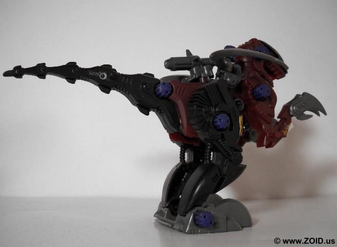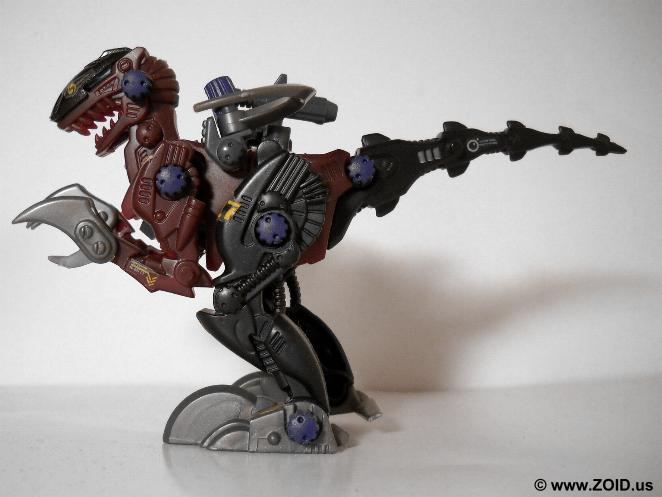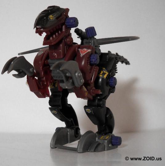 Raven Raptor had the honor of being modeled after one of the most feared and vicious of all dinosaurs, the Velociraptor. The Velociraptor was smaller than many think being about the size of a turkey, and also lacks the feathers that it was now believed to posses. Being one of the first Zoids making use of the Organoid system, the Raptor was superior in intelligence and had heightened agility and response capabilities. Designed for close combat, the Raptor does not normally mount any long ranged weapons. Created by the Guylos Empire, the Raptor relied on it's plethora of close combat style weapons including killer fangs, two large back mounted "Counter Scythes", a set of Hyper claws, and finally a set of Harken claws. The unit is also consider low on the equipment side making use of a single ion charger.