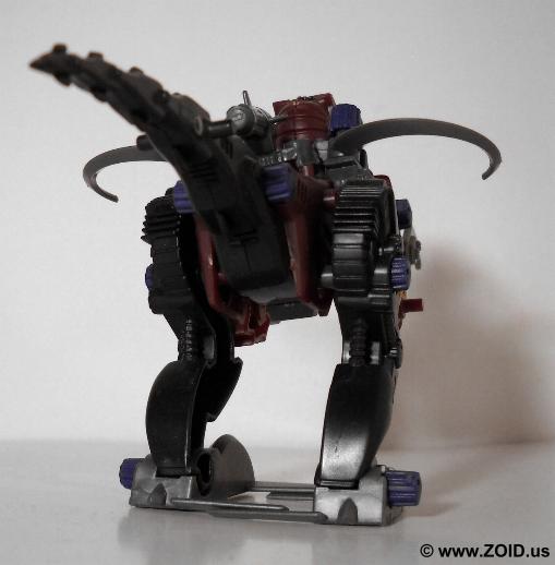 Rev Raptor is a small build, and despite the flaws commonly observed in it's engineering is a nice Zoid to have. The dual scythes and overly large claws lend it a menacing look. Rev Raptor can mount one Custom Part or "CP" unit. The CP-08 or pile bunker is a large back mounted spear / jack hammer that can function as both an offensive penetrating weapon and as a utilitarian jack hammer useful for destroying structural supports. The pile bunker is actually designed to be used in pairs rather than separately, and when mounted on a raptor gives it an even more menacing appearance.