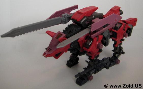 Sword Wolf was released in early 2005 and was the seventh Zoid created from the Genesis line. Colored in red, black, and grey, the Sword Wolf has a specific upgrade unit known as the "Bio Crusher". The Bio Crusher consists of a single blade along with a shield that took the place of either one of the normal Hack Blades. The Genesis Sword Wolf was the first, and last release and we did not see the planned limited version that would have been re-colored as well as come fully equipped with both the Bio Crusher and Ra Kan pilot figure.