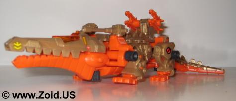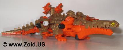 Barigator was used as the Republic's main aquatic Zoid for many years and was successfully used to launch amphibious assaults while the Republic marched on the Empire's capital, and was later employed to escort Republic forces when they landed on Nyx, where the Zoid would meet it's match known as HelDigunner. Barigator was first seen in 1985 and was part of the OJR line. The unit would see several other releases including: the OER version known as "Krok", the Robostrux version known as "Chompz". Probably the most remembered version was the Techno Zoid release known as "Armored Gator" this version sported a fluorescent orange and light tan color scheme. Harder to find, many collectors either love or hate this piece as it tends to stick out in ones mind as Armored Gator was a brightly colored addition to many a childhood toy box.