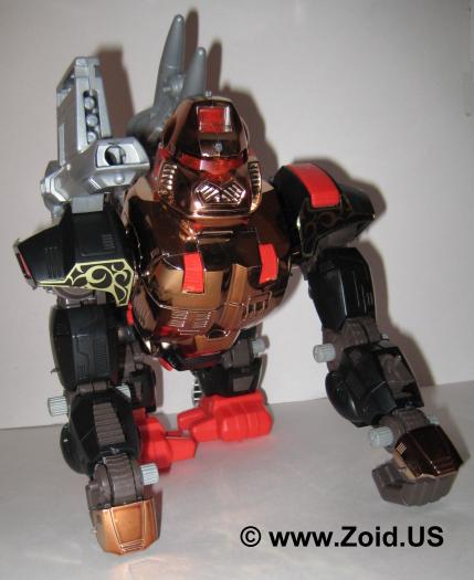 Iron Kong made it's first model appearance as "Gore the Lord Protector" (Lord Gore: The Protector) in the OER line, and was followed by the Robostrux version known as "Badox". Next came the chromed Zoids 2 version that went simply by the name of "Iron Kong". The chrome on the Zoids 2 Iron Kong can vary greatly. Some report gold bodies while others have a distinct copper tone. The Zoids 2 version is harder to come by and can fetch from $40.00 up to $100.00 for a complete version. The Techno Zoid Iron Kong was released in yellow and gray, and did not have any "back story". Armed with a set of six neon orange colored missiles, this whacky colored monkey is also harder to come by and can be put into a collection for around the same price as the Zoids 2 version ($40.00-$100.00).
