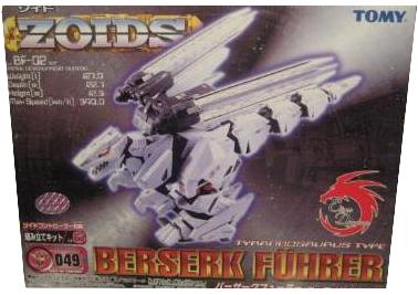The Berserk Fury or Buster F�hrer (F�hrer meaning "leader" or "guide" in German) is a Tyrannosaurus type Zoid created by the Guylos Empire. The Fury is directly based upon the wild Zoid which may have also been the basis for the Death Saurer. The Berserk Fury is very agile, aggressive, and responsive. Due to it's Organoid system it's also more intelligent than other similar sized Zoids. With a good amount of thrusters located in strategic places throughout it's body the Berserk Fury is capable of a limited degree of flight.