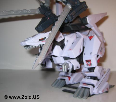 Berserk Fury also sports a pair of "Strike Claws" which can be used similar to those of Liger Zero. Additional weaponry includes: Electron Fangs and it's Strike Smash Tail. Equipment wise Berserk Fury has a Charged Particle Generator, ten vernier thrusters, two high maneuver thrusters, and ion booster pack, and four anchors. The anchors are located on the back of the Zoids feet and are used to stabilize the unit as it prepares to fire the massive charged particle cannon. The downfall of the Berserk Fury possessing the Charged Particle Cannon is that it must remain anchored in the same place to properly fire the cannon due to the high recoil of the blast. Berserk Fury is also capable of using a changing armor system or "CAS". Known as the CP-27 or "Sturm Unit" it removes the Buster Claws while increasing the speed from a 211 miles per hour to an incredible 280 miles per hour maximum. In lieu of the Buster Claws the CP-27 lends the Berserk Fury a pair of claws similar to the Geno Breakers X - Breakers.