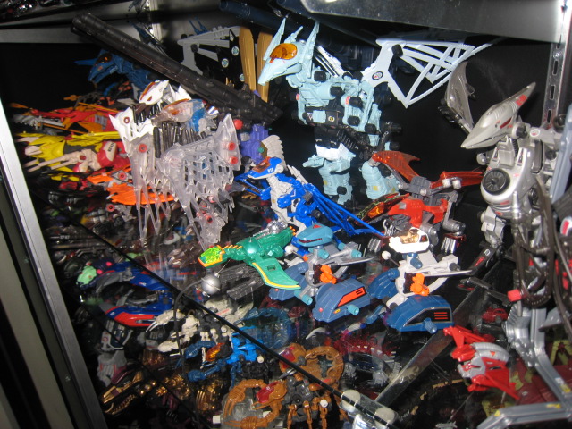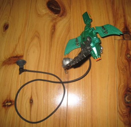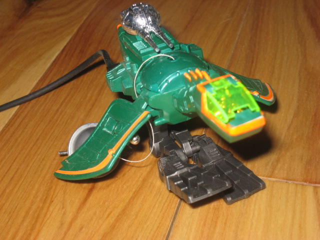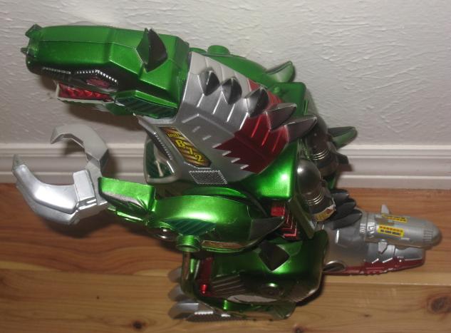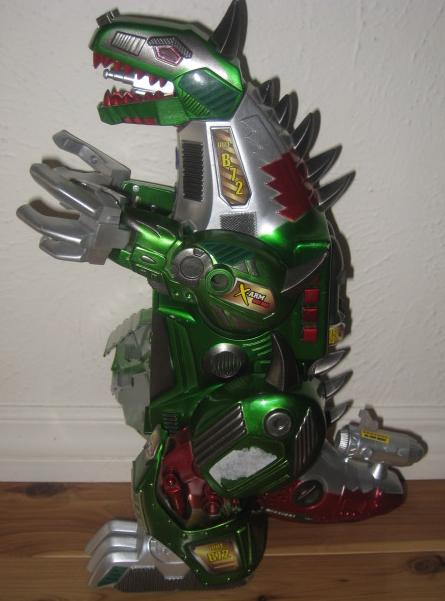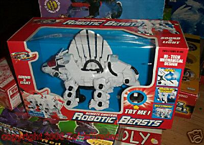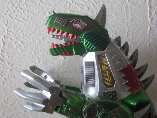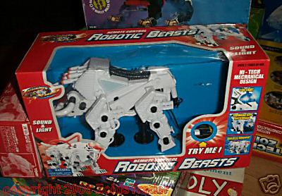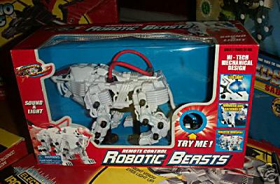 I picked these up at a local discount store. These were the only three I could find, yet there was also a Gojulas in this set. These are the "Robotic Beasts". These units have a wired remote control with two buttons. When depressed the unit's cockpit lights up red, it walks forward, and has a mechanical roar. The other button puts the unit in reverse. These "Thunder Spin" Robotic Beasts were produced in 2006 by K and B International Limited, Tsim Sha Tsui East, Kowloon, Hong Kong.