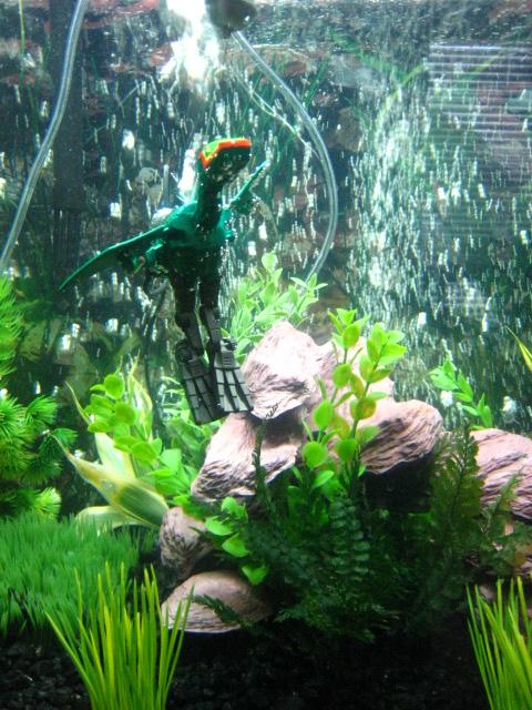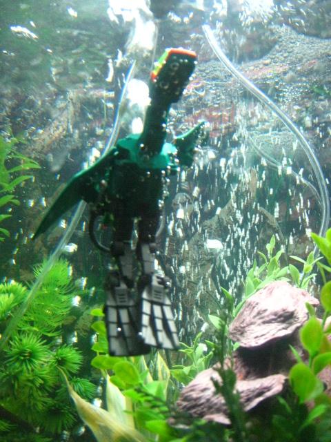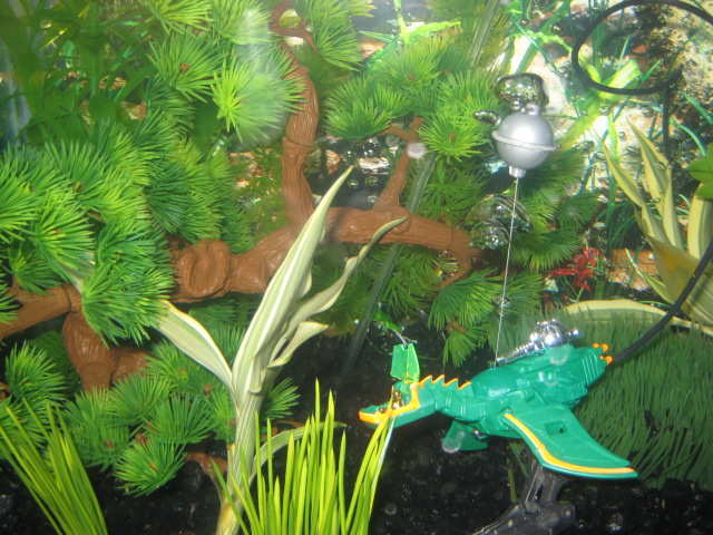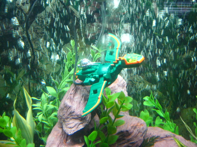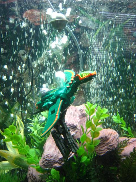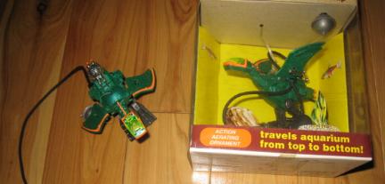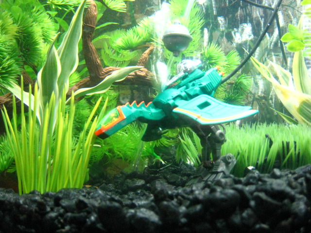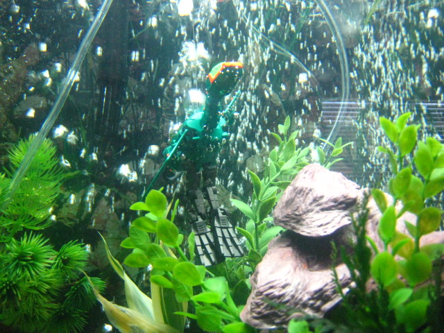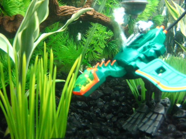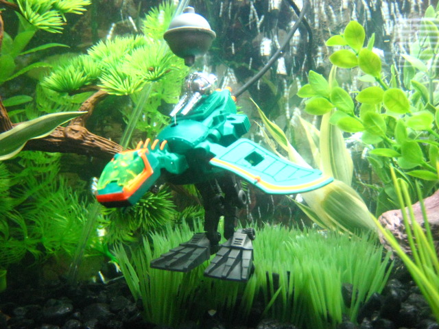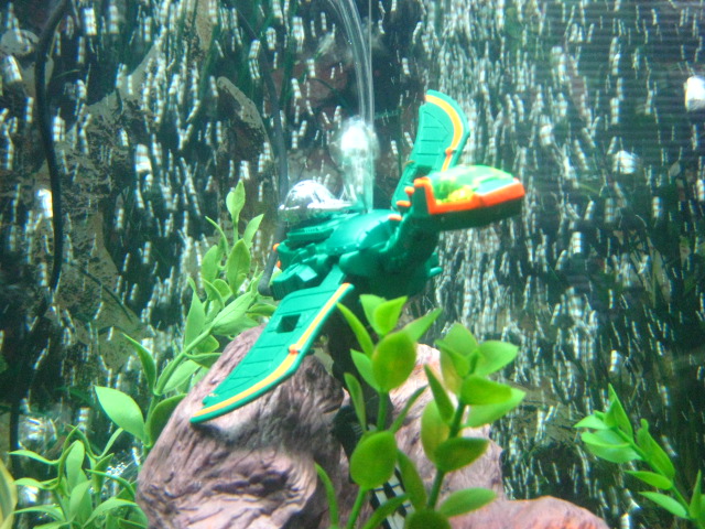 This is a very interesting "Zoid". Produced in 1990 by VENY Plastic Co. LTD. It comes complete with cockpit lid that lifts up to reveal old school gold chrome pilot figure. This interesting guy measures approx. 3" x 4" and looks awesome. He is attached to a float and rise up and down via stored air and a float. I put one in one of my fish tanks that I keep in the Zoid room and it looks absolutely wicked. These are harder to come by, if you get the chance pick one up!