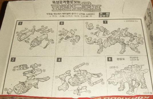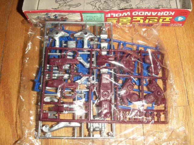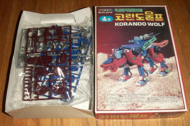 I picked this up listed as a "limited edition Chinese zoid" the "Korando Wolf" is a bootleg Zoids Command Wolf. Produced by a company named "FIRST" there are several discrepancies. The pieces are far smaller than that of a standard Zoid, it also lacks the rubber caps. In place of the standard caps are solid plastic caps. It did not come with a formal instruction sheet, the instructions are located on the top of the inside of the box. Also pictured on the box is a full set of 4 imposter Zoids including a Stego (Kit #1), a Redhorn (Kit #2), a redler (Kit #3), and this one a "Korando Wolf" (Kit #5)