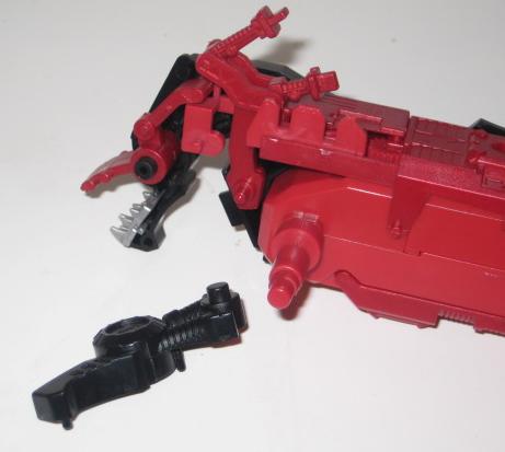 With the lower jaw now complete, the lower cannon (very reminiscent of Zaber Fang) is then affixed to the front of the unit along with a chest and back plate.
