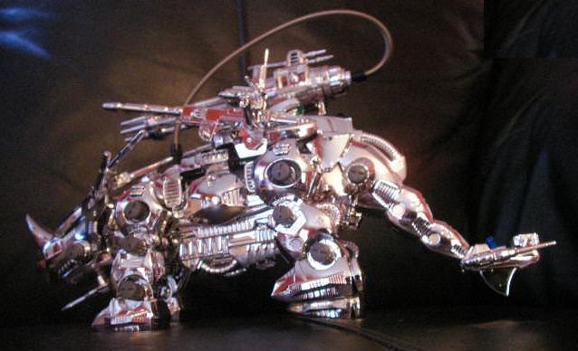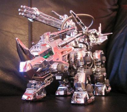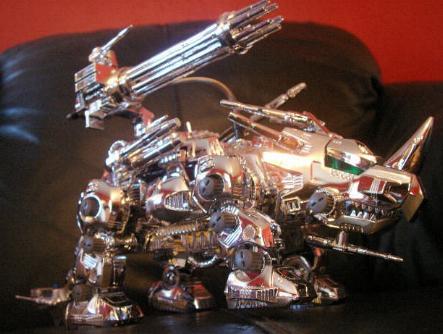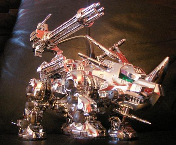 I found this Zoid on eBay. The seller had a "buy it now" option for $50.00. I quickly took advantage of it, on impulse, which I rarely do. This Zoid was located in Germany and was one of the older Leoshop chrome zoids. About two weeks later this guy showed up at my front door. I was surprised at how stunning this piece is. It was very well taken care of, no scratches on the chrome, in perfect working order, ect. Also this piece has a chromed CP-03 which have become harder to find these days. The seller told me that this piece was in his collection guarding the DVD's. The story behind this piece was that back in the 80's he went in with a friend on having some Zoids chromed by Leo. This was the largest piece that he did, and was recently moving. He decided to put this piece on eBay to see what interest there would be in it, and to his surprise it sold within minutes. I am very happy to have this in my collection, it makes a truly awesome and unique display piece.