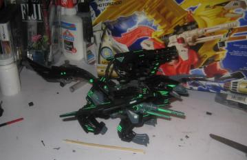 Being a vintage Dark Zoid I wanted to make sure and use the available Grade Up port. I also wanted massive firepower, so I decided on a large cannon to fill the port and incorporate hoses into the existing dual shoulder mounted cannons forming somewhat of a super triple cannon system where the hoses from each shoulder gun (if necessary) would feed the large back mounted cannon. Adding to the realism, I wanted to incorporate a heat shield that would assist in dispersing the massive heat generated by rapid fire.