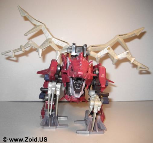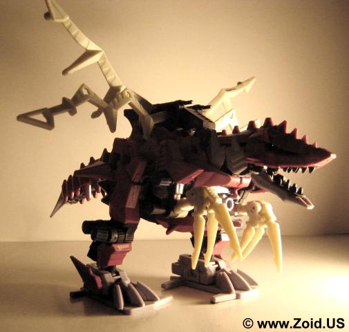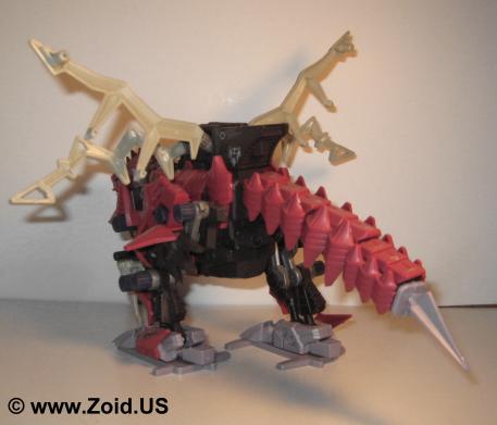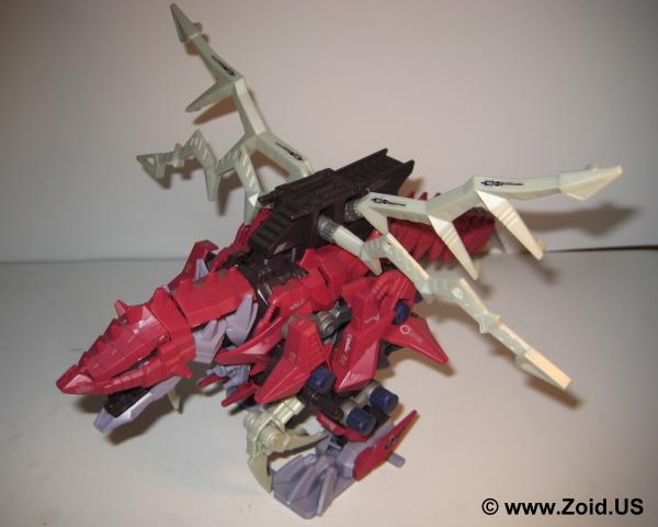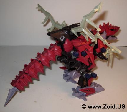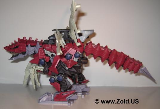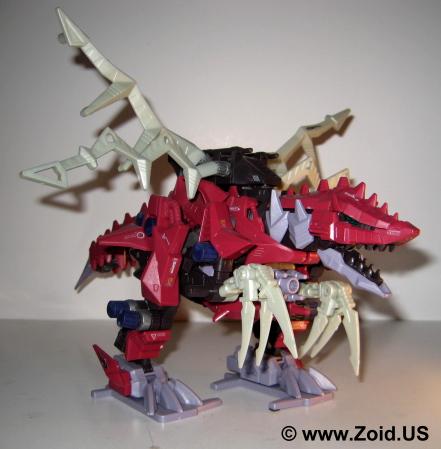The build is unique and is somewhere between a Berserk Fury and a large BLOX Zoid. The Plasma Blades coupled with the low stance and long frontal claws give the Zoid a very aggressive appearance. It hunched position gives it a realistic feel and the Zoid is very unique and distinct in it's movement. When switched on the Zoid walks forward with it's arms moving, the Plasma blades animating, and the tail swinging. The NJR line saw the release of the maroon red Death Raser as it's own separate unit, while the Genesis line received the white and blue Death Raser and Parablade combo or Decalto Dragon. A limited green version of the Decalto was released as a contest only prize. The limited version is extremely hard to locate as not many units were made. A Death Raser will run between $35.00-40.00 US, expect to pay around double for the Genesis Delcalto Dragon. The limited when it does become available usually starts bidding wars and ends up at a final price of $200.00-300.00US. Death Raser makes an excellent unit to any collection, it's odd "spikey" look is far from the normal bi-pedal Zoids on the shelf, the tail is totally different, and the unit shows how Zoids evolved at the end of the war when both ZOITEC and Zi-Arms were the main focus of skirmishes. Pick one up if you have the chance.
