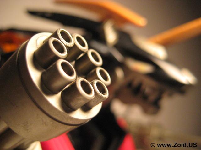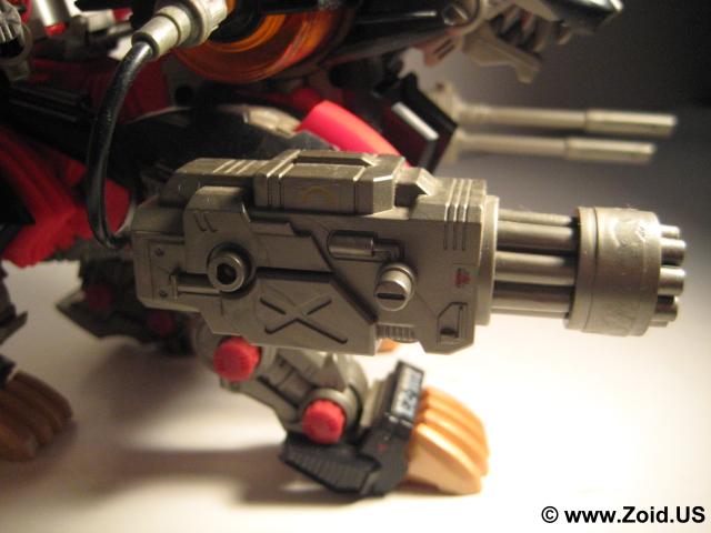 The Energy Liger also features a wide array of weapons. The first main piece of weaponry is a two barrel charger beam cannon, this is partnered with an unmistakable eight barrel charger gatling gun. Both of these weapons are powered by the energy charger, and are capable of ungodly amounts of damage. A small pair of wings also adorn Energy Liger, also powered by the energy charger, these wings make the Zoid capable of limited flight. The wings can also be used offensively as a pair of laser blades capable of cutting through an enemy as if it were a tin can. In addition to these three unique weapons the Energy Liger also has an AZ X Blade, a Gungir Horn that it can use as a lance, and each of the claws xan also serve as weapons.