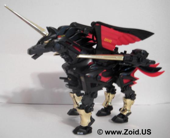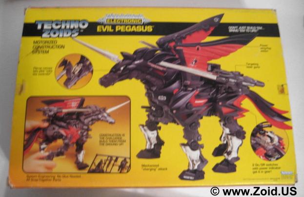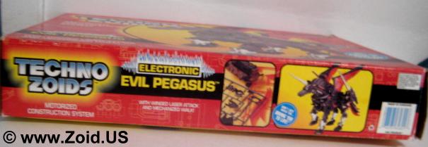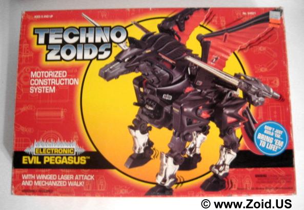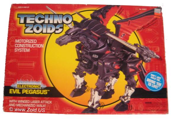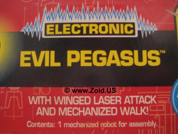 One of only two Alicorn's (mythical horse creatures sporting both wings and a single horn), Evil Pegasus was the re-release of the OJR classic "Orudios". Part of the Techno Zoids line, Evil Pegasus hit store shelves back in 1995 under Kenner via Tonka distribution. Evil Pegasus featured a dramatic color change where the former unit's white and blue color scheme was replaced by black and grey. This color change gave the Evil Pegasus a wickedly "royal" feel. With no factions in the Techno Zoid line, we can only assume that it's purpose could have been similar to it's predecessor, and Evil Pegasus was part of the antagonist army. Strangely Evil Pegasus is also one of only two Zoids with the actual title of "Evil", with the only other unit being the Evil Scorpion of the same line.