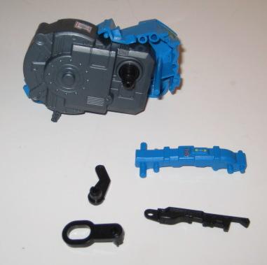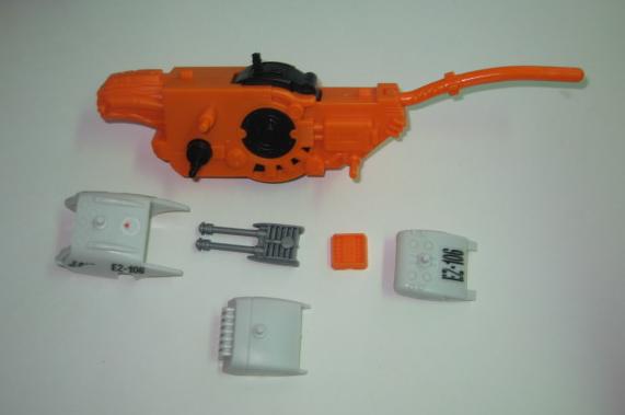 Three large covers are then placed on the body unit. Two on the top and one on the bottom. Additionally a back coverplate is attached, as well as the dual cannons that are mounted on the bottom of the unit.
