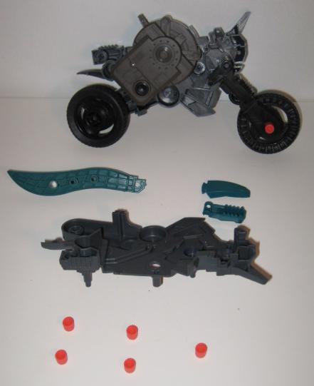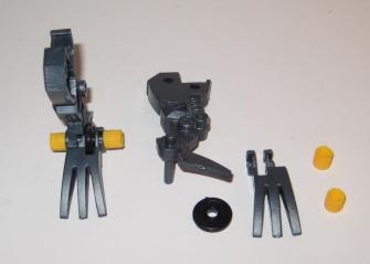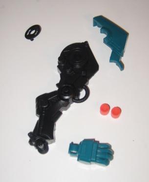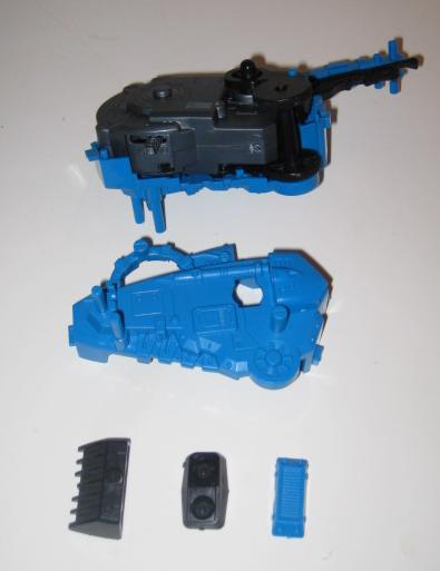 Next, the head is formed. The green lens snaps on the top head piece, and two side facial pieces house the lower jaw piece. The head attached to the main body unit via two caps.
