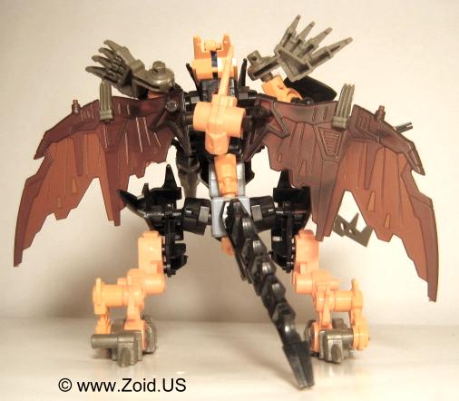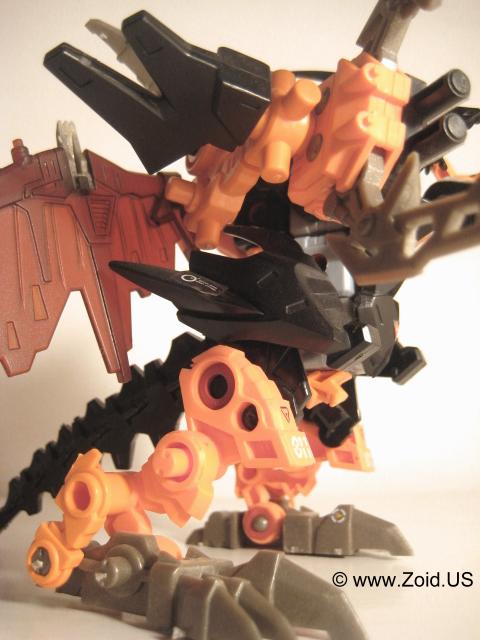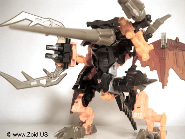 Lord Gale also has a plethora of weapons including "Hell's Fang" which (name wise) strikes a very similar resemblance to Deadly Kong's "Hell's Box". He is also equipped with a set of spears referred to as Magnesser spears on his right "hand", and a very crustacean like Magnesser claw on his left "hand". Strike Claws, X Scissors, a Magnesser tail, and a double barrel cannon make up the rest of Lord Gale's arsenal. The "Magnesser" material is usually found on aerial Zoids and "translates" roughly to a magnetic repulsion system allowing flight. Magnetic repulsion was Zoidian technology that allowed lift and propulsion as well as both vertical take off and landing capabilities. It is also said to have very low maintenance requirements allowing the Zoid in possession of Magnesser armaments an extreme amount of in flight time before having to be serviced. I'm speculating that Lord Gale used it's tail as a rudder, and it needed to be just as capable of performance as did the wings thus it is also listed as being composed of Magnesser.