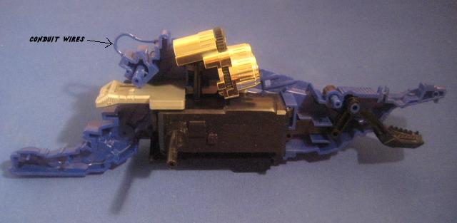 One of the most interesting internal features of Gun Bluster is the on/off switch which is placed over the motor and push or pulled to turn the unit on and off. Another interesting fact is that the OJR version features a pair of conduit like wires on both body halves that are not present on the newer releases. (Noted below)