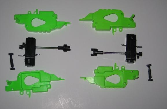 First, the motor is inserted between the two green body halves and the cannon support is also placed.