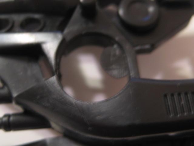 The straffer cannn is then assembeled. Two sides of the cannon attach, and two supports are held in place on the main frame via two caps.