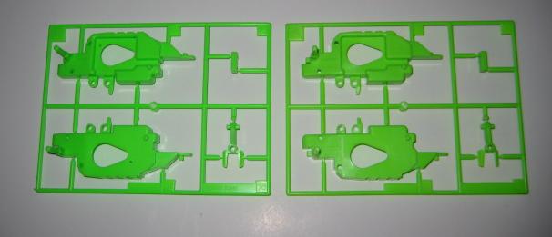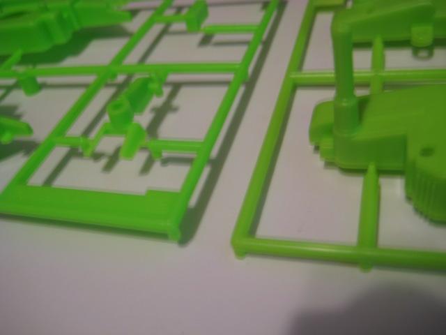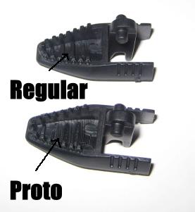 The sprues have minor differences as well. The green sprues that come with the regular release are a brighter green, while the green sprues that came in the protobox are lighter. This is harder to see in the pictures below, but the contrast can be noticed. I do not think there was enough time for this to be sunlight exposure damage as it likely remained in the box.