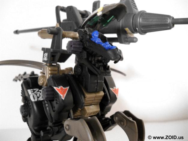 Rev Raptor is a small build, and despite the flaws commonly observed in it's engineering is a nice Zoid to have. The dual scythes and overly large claws lend it a menacing look. Rev Raptor can mount one Custom Part or "CP" unit. The CP-08 or pile bunker is a large back mounted spear / jack hammer that can function as both an offensive penetrating weapon and as a utilitarian jack hammer useful for destroying structural supports. The pile bunker is actually designed to be used in pairs rather than separately, and when mounted on a raptor gives it an even more menacing appearance.