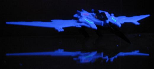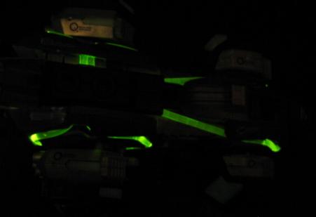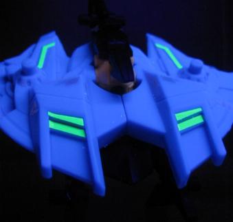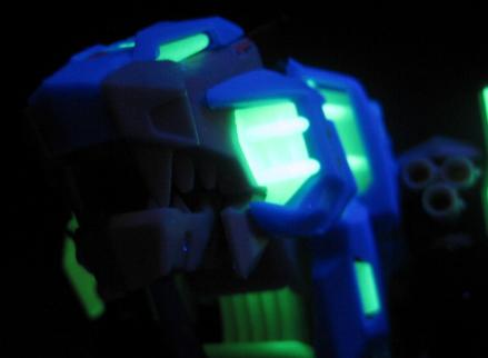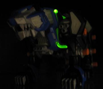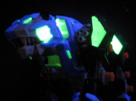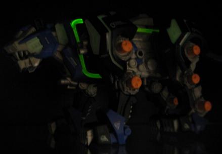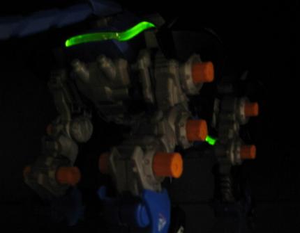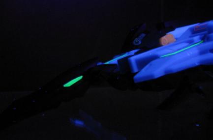 When you turn this unit on, it stomps forward, and without the aid of the UV light, the fiber optic cables that run through the front shoulder and back shoulder plates illuminate. Again, this is harder to photograph, but below are my attempts.