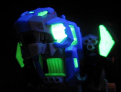 The head features 3 glow in the dark parts including the eye lens. The complete head is awesome, if you look closely you can see that the blue plastic has a metallic fleck to it, which just makes the blue pieces "pop.+-"