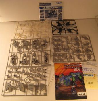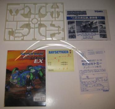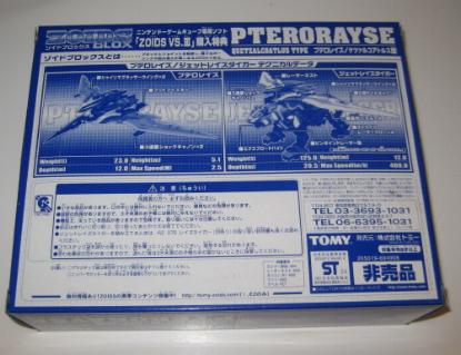 RZ-075, Rayse Tiger is a unique Zoid in that it has the ability to absorb energy from enemy attacks via the special panels that adorn its body. Rayse Tiger is one of three Zoids from the "Three Tiger" story line in, which ancient Zoid Cores were discovered and reanimated. Rayse Tiger is an awesome model, first it sports glow in the dark pieces, and second, it is the very first to use the fiber optic lighting system. (The fiber optics were also featured on the Genesis remake of Rayse Tiger: Soul Tiger.) I would also like to take some time in this review to cover the harder to come by upgrade unit for this kit titled: "Ptero Rayse". Petro Rayse is a smaller kit that was released alongside the Game Cube Game Zoids Versus III. Ptero Rayse seems to be more elusive than it's other video game counter parts Sauro Knights and Blade Hawk, and more on Transhawk's rarity level. I was lucky enough to score this small kit on Yahoo Japan recently, and decided to present them both in their entirety. Enjoy!