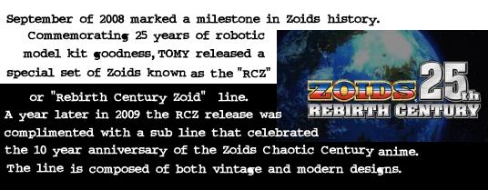The Rebirth Century Zoids are designated with either a "HRZ" or "GRZ" prefix followed by the normal numerical suffix. 15 models make up the core of the RCZ line, it also hosts two limited edition re-colors (Valga and Godos), and one Dark Zoid (Merda). The majority of the RCZ's are re-releases of classic OJR Grade Up's, but the line also includes a few exclusive designs. Accounting for the re-release of vintage Zoid designs, the RCZ line is set in a previously untold time period on Planet Zi. Filling the void between the end of the OJR and the beginning of the NJR, the RCZ line focuses on the efforts of Planet Zi's inhabitants to restore and re-build after the infamous meteor strike. The 10th anniversary sub-line has honored both the Shield Liger and the Schubaltz Custom Iron Kong with a true to the Chaotic Century anime color scheme