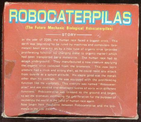 "In the year of 2295, the human race faced a biggest crisis. This Earth was beginning to be ruled by machines and computers (bio-metals) been parasitic on by a new type of organic virus (provides proliferating function by changing metal to organic matter) which had been transported by a metercrite. The human race had to escape underground. They manufactured a new creature applying the organic virus collected from the biometals. This new born creature had a thick and strong shell, so he could resist any attack from outside as a sphere attitude. His staple good was the metals other than his comrade. He was equipped with the proliferating function like the viometals. This creature was named "Robocaterpilas" and was studied and developed scores of sorts with different functions. Robocaterpilas was released to the ground and began to eat the biometals continuing the proliferation fro the purpose of recovering the world in the hand of human race again. Now began the battle between Robocaterpilas and the biometals in the year 2300."