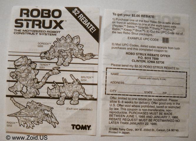 The Robo Strux line was distributed in the US by the Tomy Corp. located at 901 E 233rd Street with P.O. Box 6252 in Carson California, 90749. On August 21 back in 1977 the Tomy Corporation, a subsidiary of Tomy Kogyo of Japan signed a 20 year lease for a 24,00 square foot plant in Carson California. It was at this location (Not the current Santa Ana headquarters) that US based collectors were first graced with the Robostrux line. Aside from toy stores running their own Robostrux promotions, there was a factory rebate offered. Oddly enough the address to claim mail away rebate was located in Iowa. To obtain the $2.00 rebate one had to purchase one large battery powered Zoid and one small wind up powered Zoid from the first wave of release.