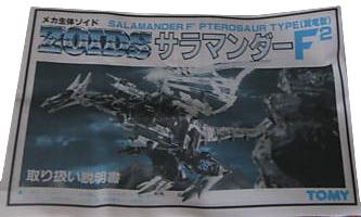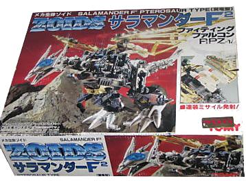 Produced back in 1989, Salamander F2 is one of the hardest OJR Zoids one can come by. This improved version of Salamander was used by the republic in the Original Battle Story along with the Mad Thunder to penetrate deep into the heart of Nyx. The F2 or "F square" version was lighter, and able to reach top speeds of an impressive Mach 3.5. The Salamander F2 units met their demise with a worthy unit, the Gilvader. The few that managed to elude the "Death by Gilvy" were destroyed by the cataclysm, which effectively produced the cessation of existence of the Pterosaur type Salamander F2.