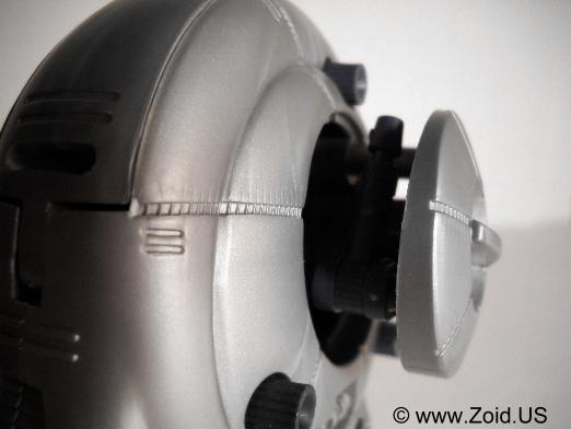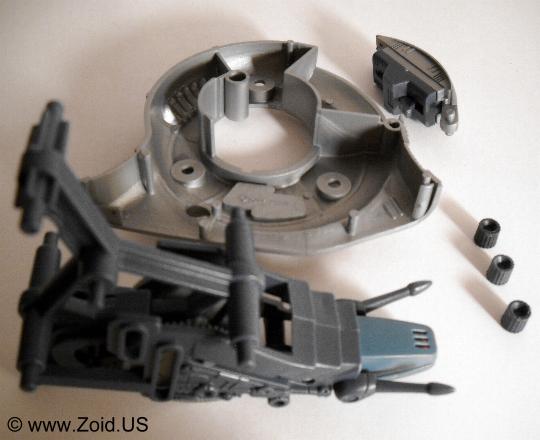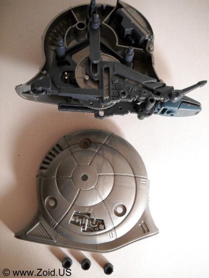 Next, the framework - complete with neck - is affixed to one shell body half. The missile launcher is then held in place via three caps.