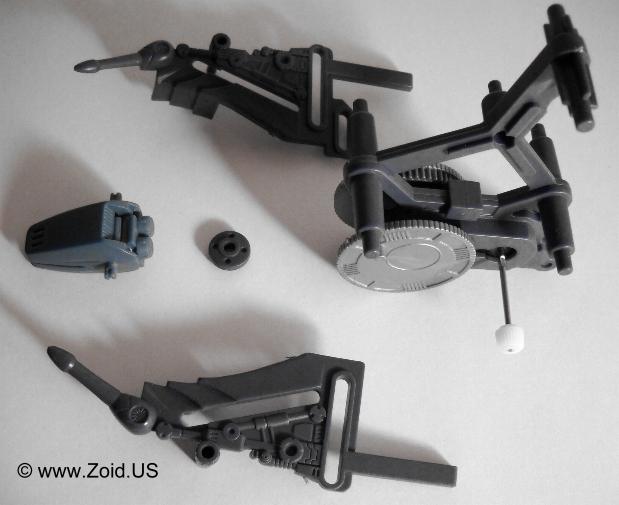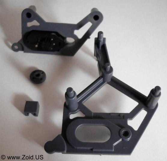 The first step in construction is building the complex frame work of this small wind up Zoid. The motor is centered in two halves, in which a small wheel is centered