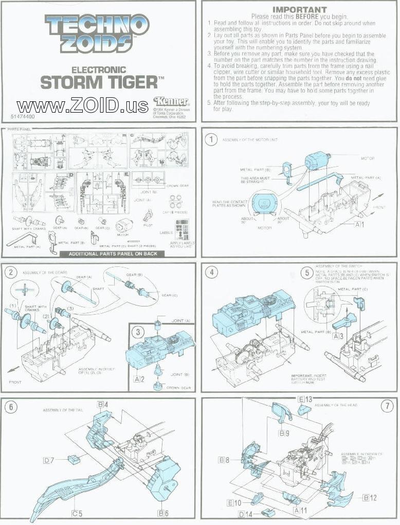 Below is a scan of the dual sided instruction sheet that accompanies Storm Tiger. When I first layed out the parts to start building I found myself asking: "Where the hell is the motor?" Unlike any other Tehcno Zoid the motor is not assembled and requires building. Let's take an in depth look at the build of this unit.