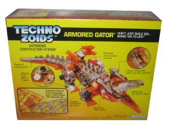 Along with the other Technozoids, Kenner gave us this fluorescent piece of eye blinding goodness. The gator Zoid design has always been a favorite, the reptilian nature of the piece is conveyed very well in Zoid form. For some reason this piece seems to be one of the harder to locate pieces of the Technozoid line. The gold accents mix surprisingly well with the orange and the overall color scheme is "unforgettable" to say the least. The back of the box features the complete unit along with a list of features.